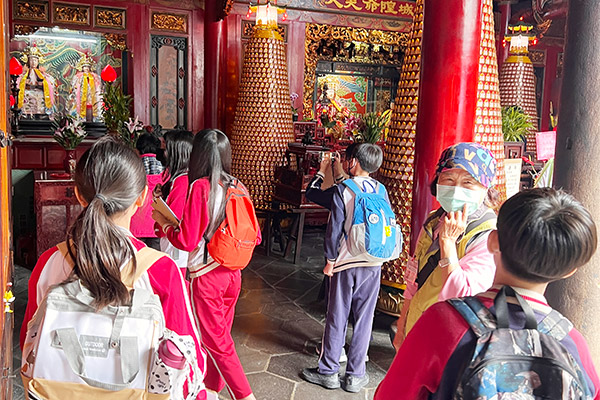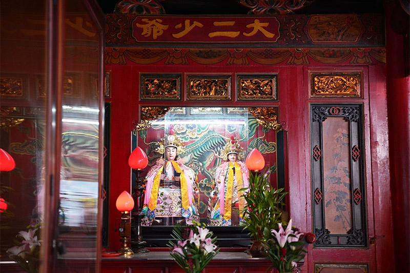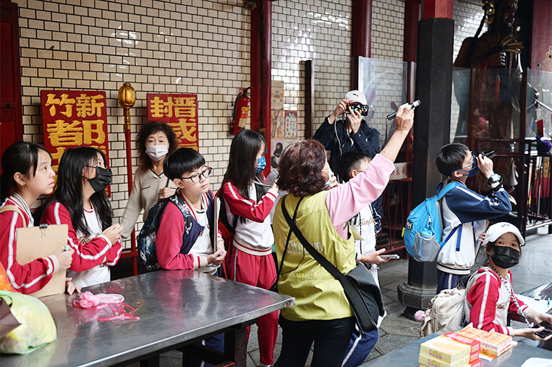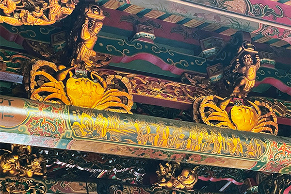 Hsinchu City Chenghuang Temple’s “Cheng” means the city wall, and “huang” means the river runways. Left dragon and right tiger, left clock and right drum, in the form of gods’ sitting posture, people will go into the temple from the left, and come out on the right side. When you get into the temple, you must be careful not to step on the threshold. Straddle through the threshold means to be respectful to the gods. At the top left of the temple, there are four crabs whose claws take four things - writing brush, inkstone, ingot, and roundabout. The writing brush and inkstone means to be knowledgeable. Roundabout means that being a person, you need to be harmonious. The ingot means that you need to be calm to do anything.