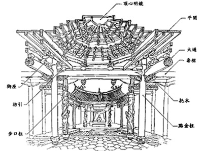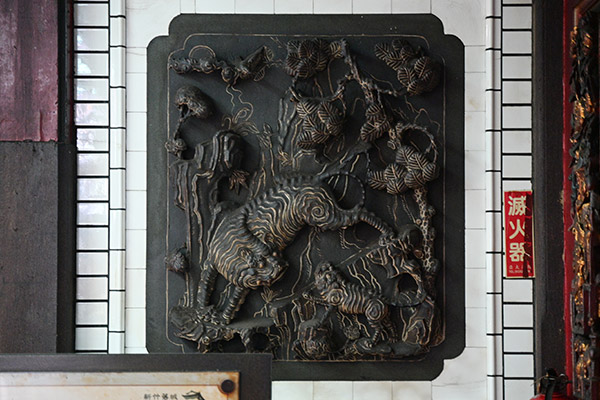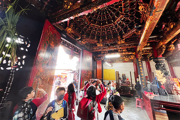 Most of the existing stone carvings on the front hall walls are the representative works of this period. The Hsinchu City God's Temple faces east to west and slightly north. It is a temple building with three bays, three entrances and two corridors, with the Guanyin Hall on the left. There is a pair of blue stone lions with classic simplicity in front of the middle door of the front hall, and an octagonal caisson is installed on the ceiling inside the door. The main hall is consecrated to the City God, and the back hall is consecrated to the City God's wife.