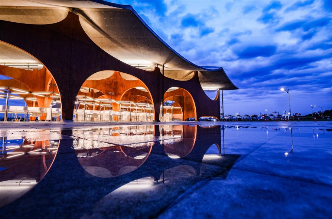 Boguang Market: Hsinchu Boguang Market is like an outdoor food feast at Hsinchu Fishing Harbor. In the past, more than seventy stalls were disorganized, making it feel like searching for treasures in a flea market. Now, to provide a more comfortable space for vendors and visitors, the market is equipped with independent sinks, running water, and power outlets. Its appearance is like a work of art, with concrete walls and fresh, simple decor, allowing every guest to enjoy food in a hygienic and comfortable environment. Designer Lin Shengfeng's creativity is unique, transforming the inspiration of the ocean into a wave-shaped roof, a first-of-its-kind "wave" style in the country. The wall design draws from the golden beach at sunset, and under the night lights, it adds a charming atmosphere, making people want to stay longer.